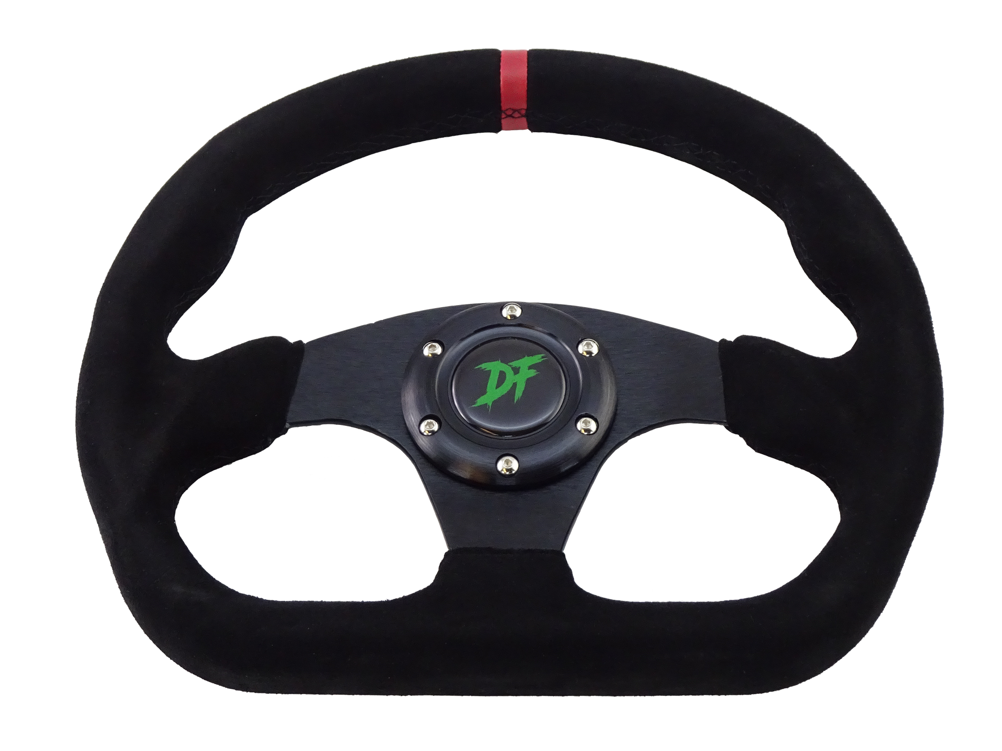 DF Kit Car branded D-shaped steering wheel wrapped in suede. Does not include mounting hardware.