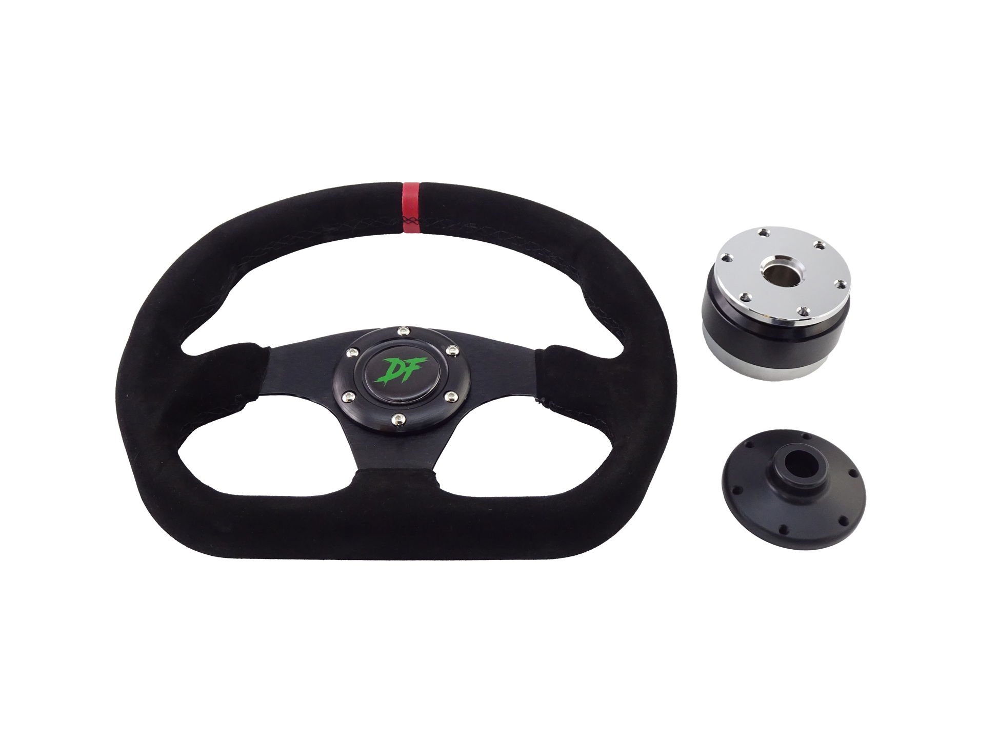 DF Kit Car branded D-shaped steering wheel wrapped in suede. The full kit includes the steering wheel, quick release and splined hub adapter.
