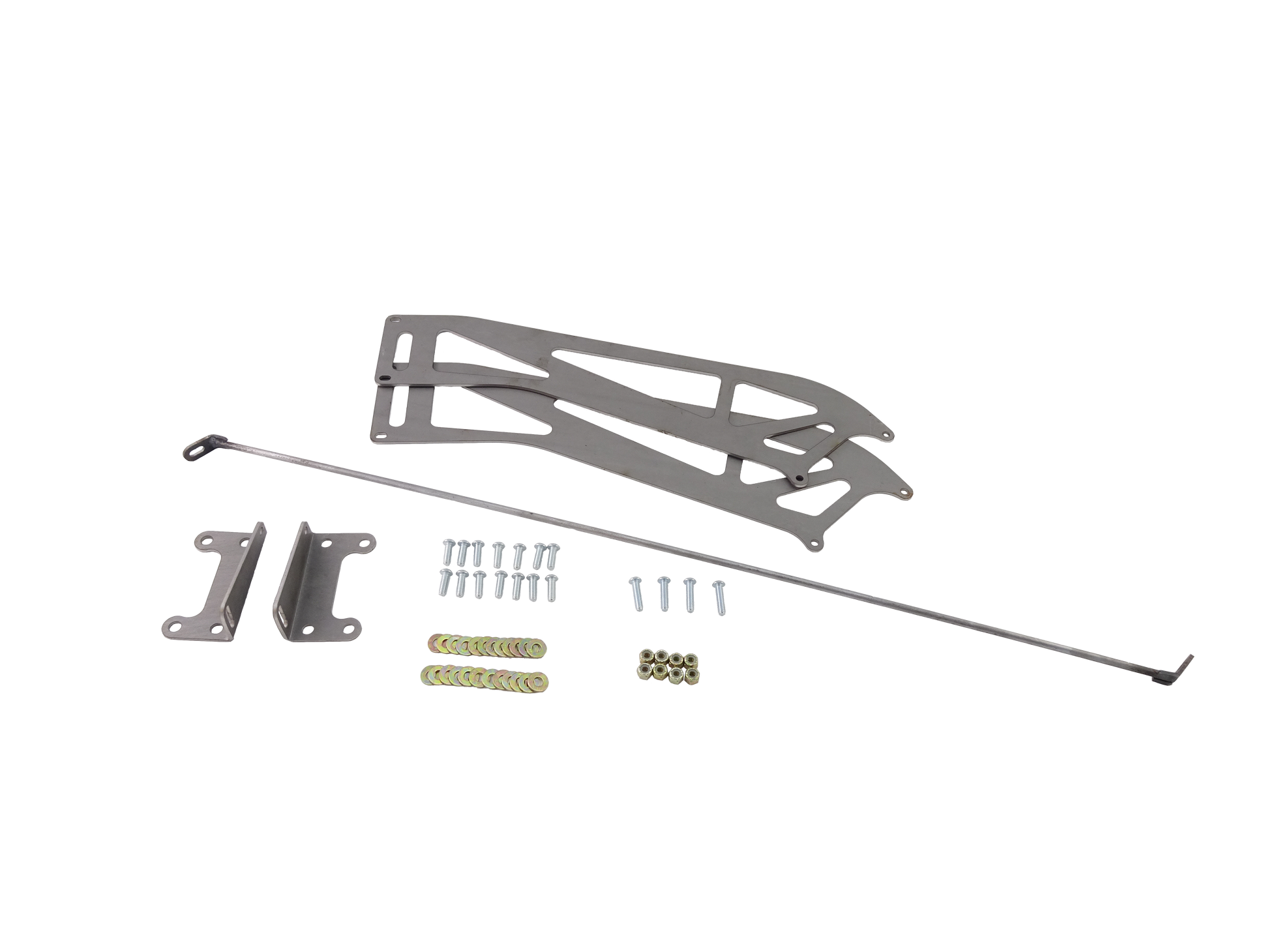 The wing mount kit includes two uprights designed to fit the Goblin, two 90 degree brackets to attach a wing to the uprights, a single support rod to sturdy up the mounts and fasteners to bolt it all together.